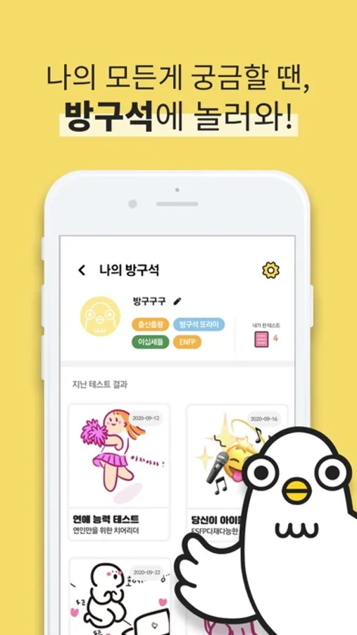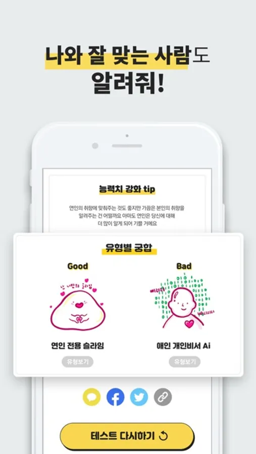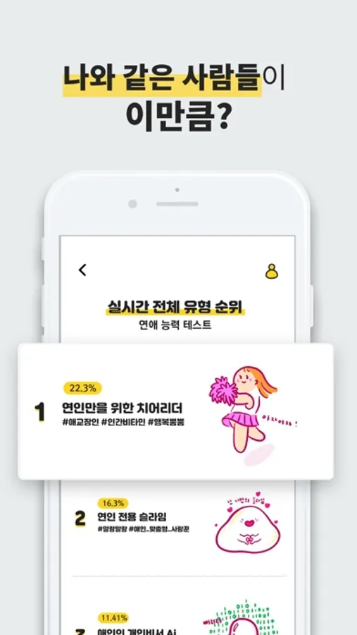나와 비슷한 사람은 얼마나 있는지, 나랑 잘 맞는 사람은 어떤 사람일지… ‘ 나’ 에 대한 모든 것을 알아볼 수 있어요.