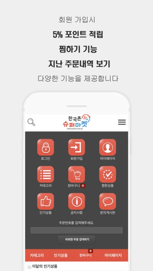 싱가포르 한국촌에서 운영하는 싱가포르 최초 온라인 한인마트 앱입니다.
