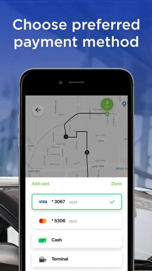 Once you have requested rideshare, cab service or airport transfer, you can check the distance between you and your taxi service, as well as your movements to the destination point on the map. You always know the transportation or rideshare price before you book taxi.