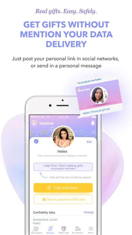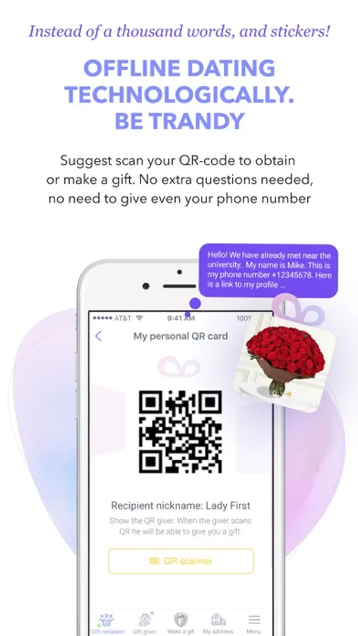 In clubs, restaurants, on the street, whatever life situation just show your QR code to make or receive a gift without getting into personal space and without showing out your personal data.