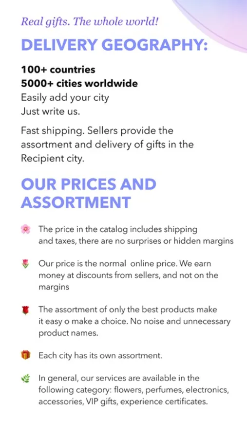 100+ countries and 5000+ cities around the world are already available in our service. We are constatly expanding the coverage geography. Your city is missing? Please write to us and we will add it during the day.