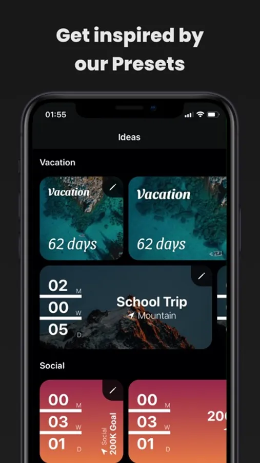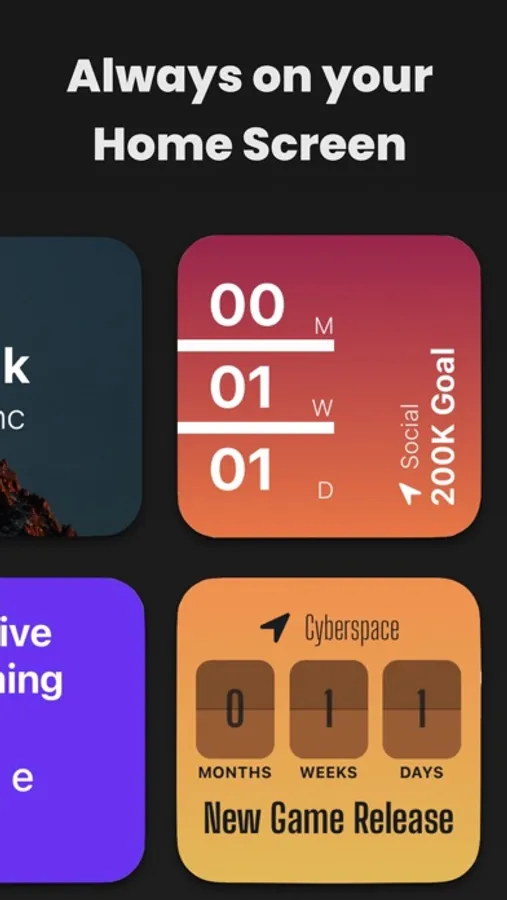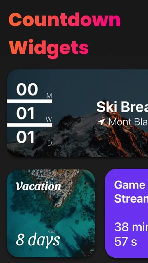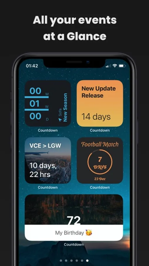 Create Countdowns for all your special events: Holiday, Birthday, Christmas, Halloween, Wedding, Anniversary, Exams, Graduation and more.