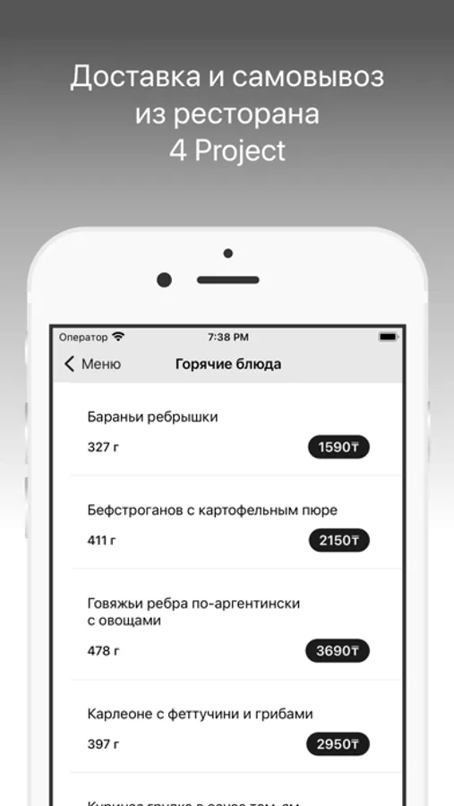 Как сделать заказ в приложении “Доставка 4 Project”: выберите понравившиеся позиции из меню, добавьте их в корзину и перейдите на экран оформления заказа (по нажатию на иконку корзины).