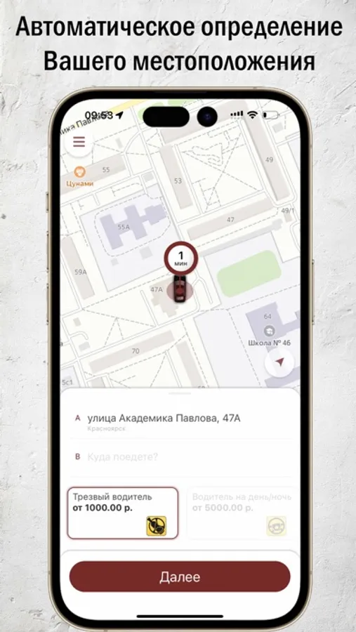 Вам не обязательно знать, где вы находитесь. Приложение само определит ваше местоположение. Нужно лишь указать точку назначения. Наблюдайте на карте в режиме онлайн за передвижением Вашего водителя.