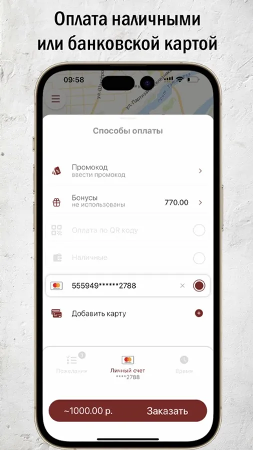 Оплачивайте поездку наличными, банковской картой и бонусами.