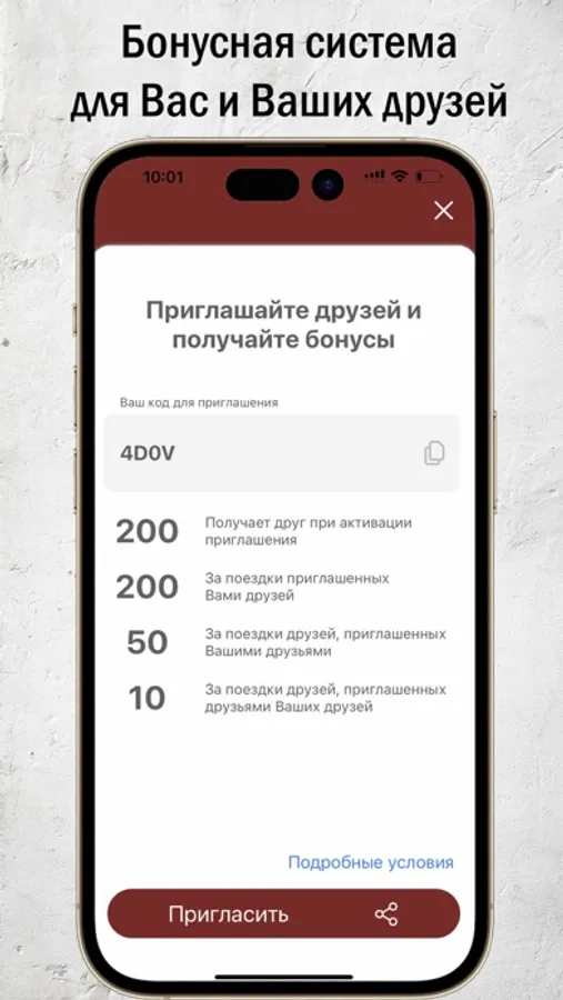 Делитесь вашим личным реферальным кодом с друзьями в социальных сетях и в магазинах приложений, получайте бонусы и используйте их для выгодных поездок.