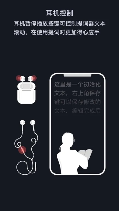 -在手机与耳机连接的情况下,打开提词拍客App进入文本提词模式或视频提词模式后,单击线控耳机控制开关即可实现提词区域播放及暂停功能。(支持有线耳机及无线蓝牙耳机)目前适配苹果原有线耳机、无线耳机AirPods