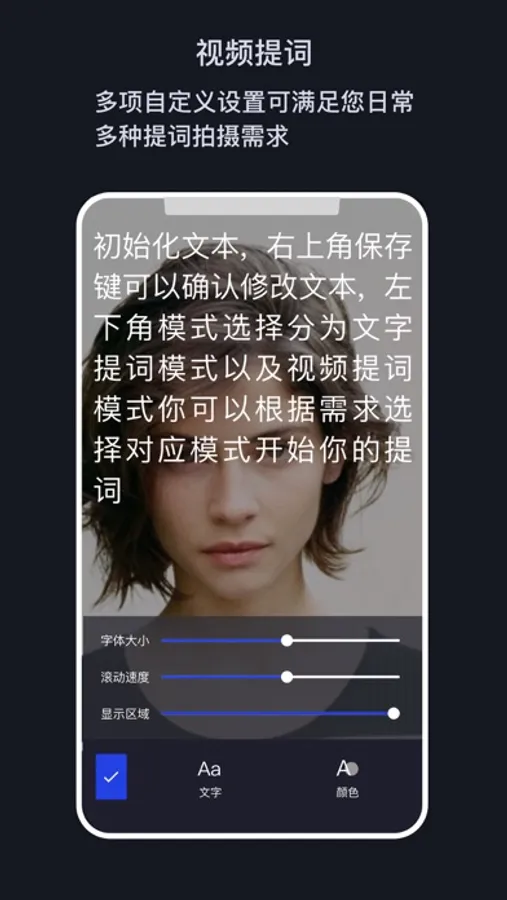 -进入提词模式后你可以通过设置按钮修改设置参数,包括字体大小、滚动速度、显示区域、字体颜色、背景颜色、以及镜像模式。