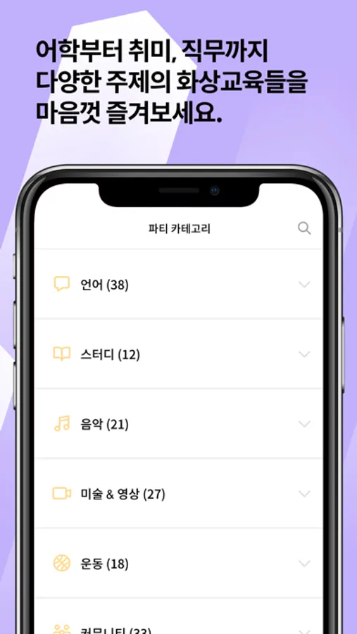 올더파티에서는 영어,스페인어, 중국어, 일본어, 아랍어, 에스페란토어 등 기존에는 접하기 힘든 다양한 어학은 물론, 명상, 보컬트레이닝, 홈트, 다이어트 등 취미, UI/UX, 프로그래밍 등 직무까지 약 80여개의 무료화상교육이 진행되고 있습니다.