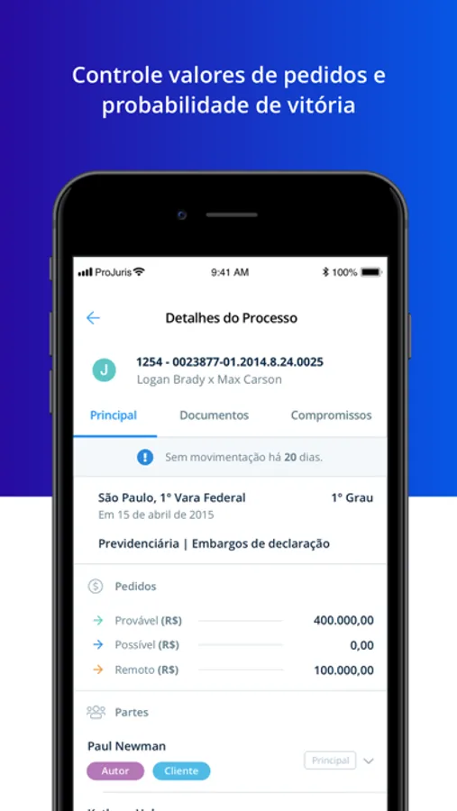 Mesmo fora da empresa mantenha o controle sobre os valores de pedidos e provisionamento. Agende compromissos para você e para seu time e consulte documentos e dados dos processos onde quer que esteja. Conte com o ProJuris para expandir o desempenho de seu time e de sua empresa.