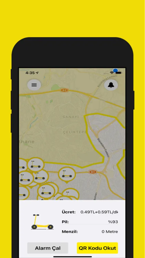 Uygulamamıza telefon numarası ile kayıt olabilirsiniz. Uygulamada sizi kullanım özet bilgileriniz ile konumunuza en yakın scooterların listesi karşılamaktadır.