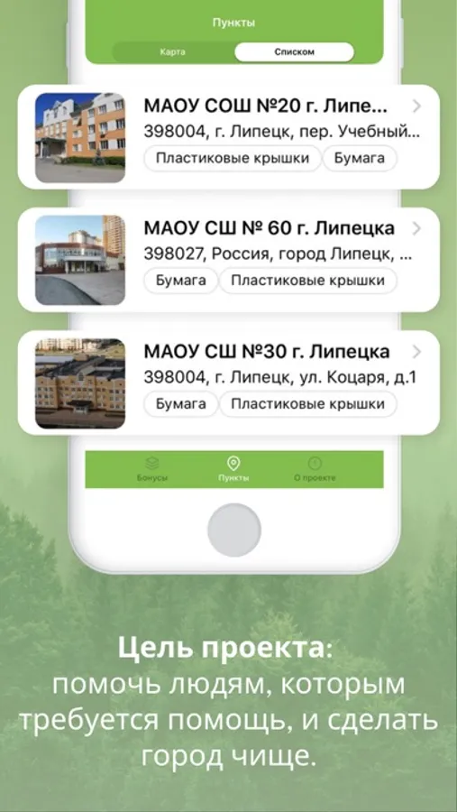 Цели проекта: помочь людям, которым требуется помощь и сделать город чище. При поддержке Фонда президентских грантов, в школы устанавливаем урны для раздельного сбора отходов. Эти урны можно отправлять только два вида отходов – пластиковые закручивающиеся крышки от пищевых продуктов и макулатуру (книги, журналы, тетради, белую бумагу формата А4) и все.