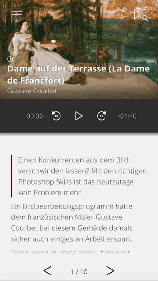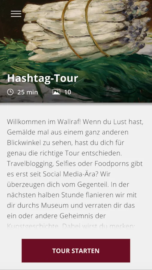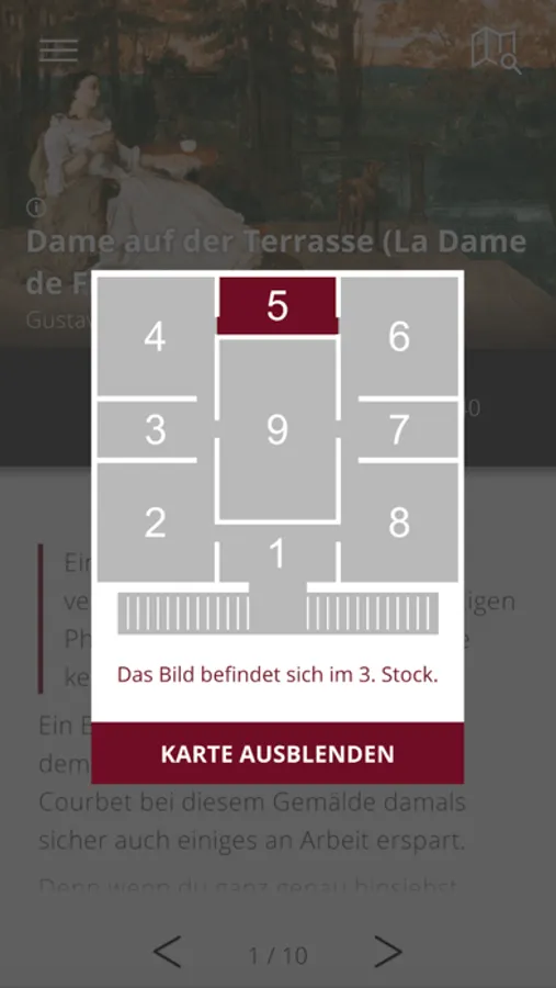 Wählen Sie begleitend zu Ihrem Besuch eine oder mehrere Kurzführungen aus und lassen Sie sich über die Kartenanzeige zum jeweiligen Bild leiten. Hören Sie der Führung zu oder lesen Sie den Text auf Ihrem Smartphone mit und entdecken Sie neue Details durch Zusatzbilder.