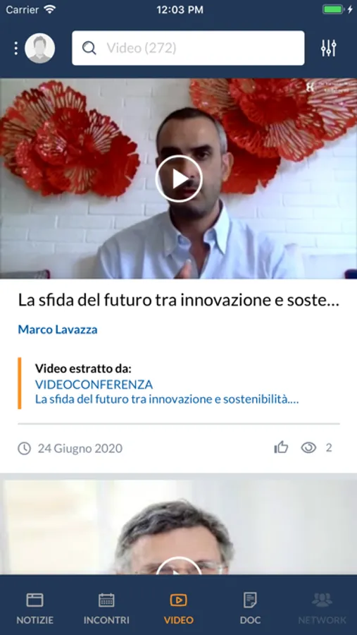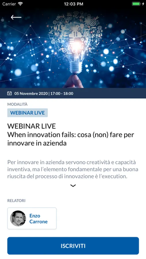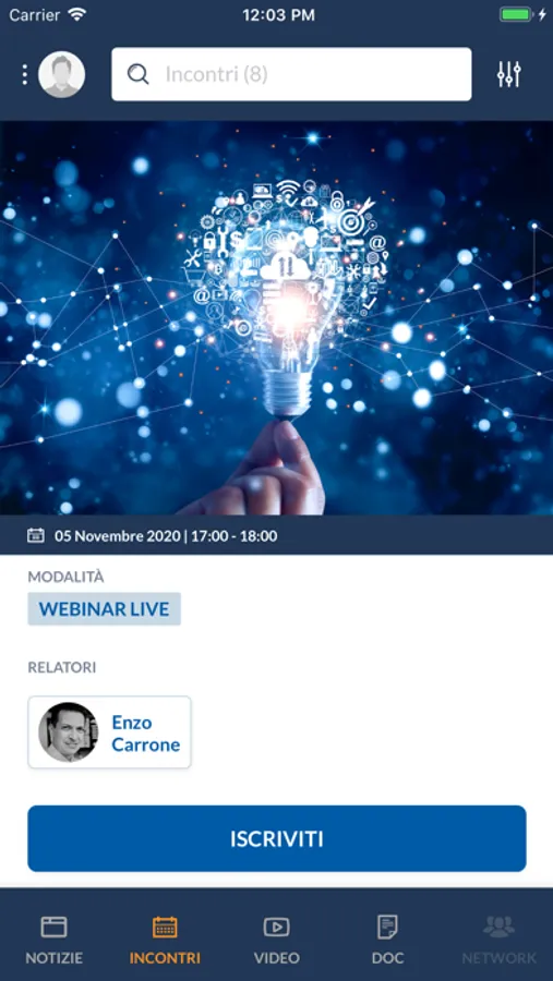 Dal Menu principale è possibile visualizzare l’elenco dei prossimi incontri, iscriversi, richiedere il kit informativo, conoscere i dettagli della sessione e dei relatori, visualizzare la mappa del luogo dell’evento. E’ possibile anche rivedere i video e scaricare le letture di approfondimento consigliate per ciascun tema. Alla voce “My network” si possono scorrere le informazioni base di tutti gli altri iscritti al servizio, con i riferimenti all’azienda e alla carica ricoperta e con l’elenco delle partecipazioni comuni agli incontri. Un motore di ricerca integrato nella APP permette di cercare contenuti filtrandoli per aree tematiche o aree geografiche.
