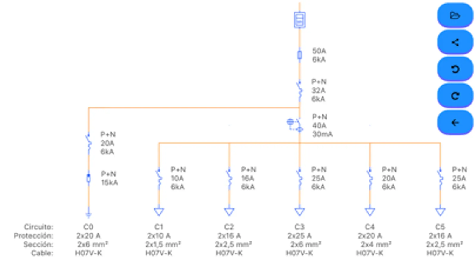 Circuit breaker, plug-in, switch, disconnector, fuse, differential (RCD), contactor, motor, generator, socket, plug base, contact, normally open NO, closed NC, valve, level, temperature, delay and advance opening and closing, limit switch, handle, interlock, push button, mushroom, lamp, grounding, energy meter, active (kWh) wattmeter, reactive (kvar) varimeter, transformer, voltage, current, three windings, overvoltage, thermal relay, magnetic, coil, clock, minimum and maximum voltage, starter, rectifier, inverter, battery, converter, AC/DC, DC/DC, frequency meter, voltmeter, ammeter, ohmmeter, soft starter, variable resistance, reactance, diode, varistor, heater, fault, star-delta transformer, insulation, regulator, connectors, conductors, phase, neutral, ground, protection, fan, photovoltaic panel, control, load and enter text such as volt, ampere, watt, energy