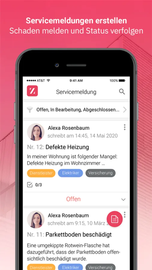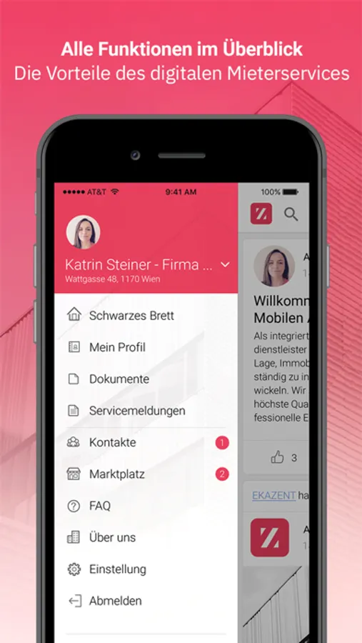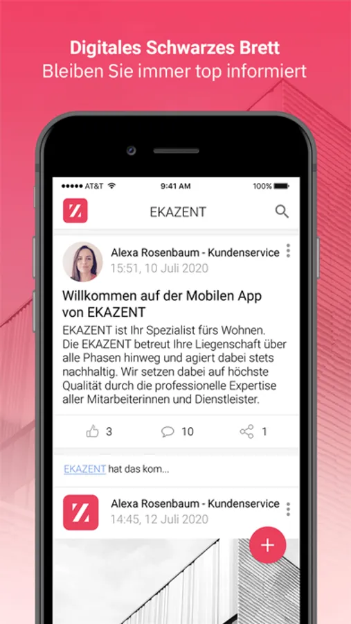 Profitieren Sie von der Ekazent App und melden Sie uns Ihre Schäden und Anliegen rund um die Uhr bequem über unsere Mieter-App. Zusätzlich können Sie über Ihr Smartphone, Tablet oder Computer wichtige Dokumente digital abrufen, jederzeit einsehen und wichtige Informationen rund um die Immobilie via Push-Nachricht direkt auf Ihr Handy erhalten. So sind Sie jederzeit über Ihre Liegenschaft bestens informiert - unabhängig vom Ort Ihres Aufenthalts.