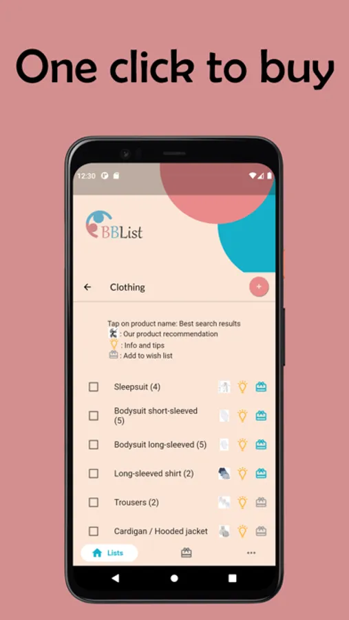 In the Baby Basic List (BBList) app, every item you could possibly need as initial equipment for your baby is neatly organized in various lists (the selection of items is based on our experience, the experience of our friends and family and the recommendation of our midwives and pediatricians). We are only recommending items that are truly necessary. In addition, you will also find a practical packing list and packing instructions for the Hospital (Maternity clinic).