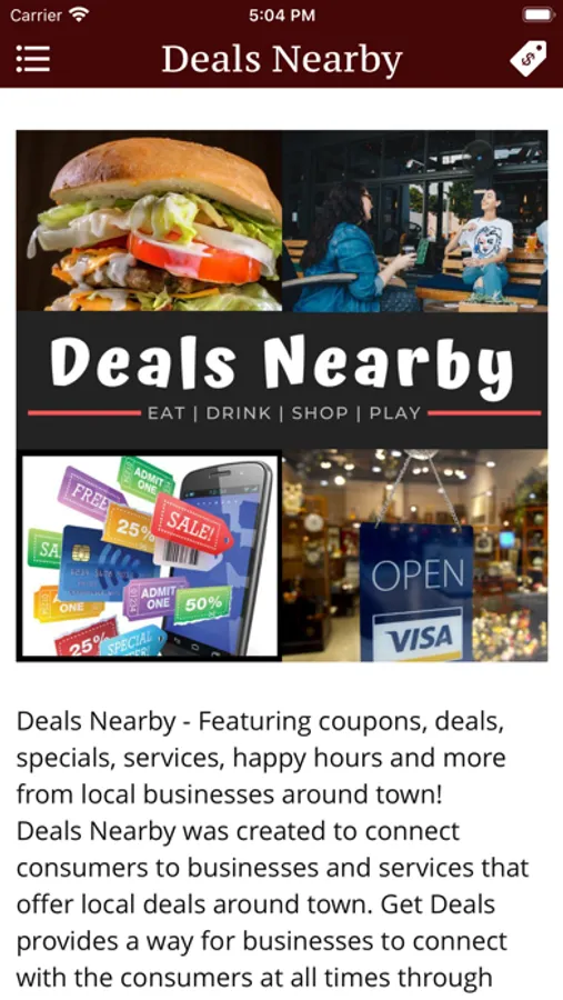 Deals Nearby - The Local Deals was created to connect consumers to businesses and services that offer local deals around town. Get Deals provides a way for businesses to connect with the consumers at all times through their phone, while also expertly distributing deals magazines around town. Consumers are able to view deals around town 24/7 from their phone and simply show the deal to the selected business to activate it. While also having the option to use deals & coupons from our deals magazines distributed that are distributed as well.