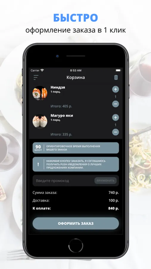Скачивайте наше приложение, оформляйте заказ и наслаждайтесь любимой едой, где бы Вы ни были! Приятного аппетита!