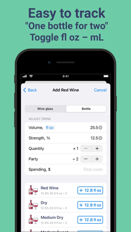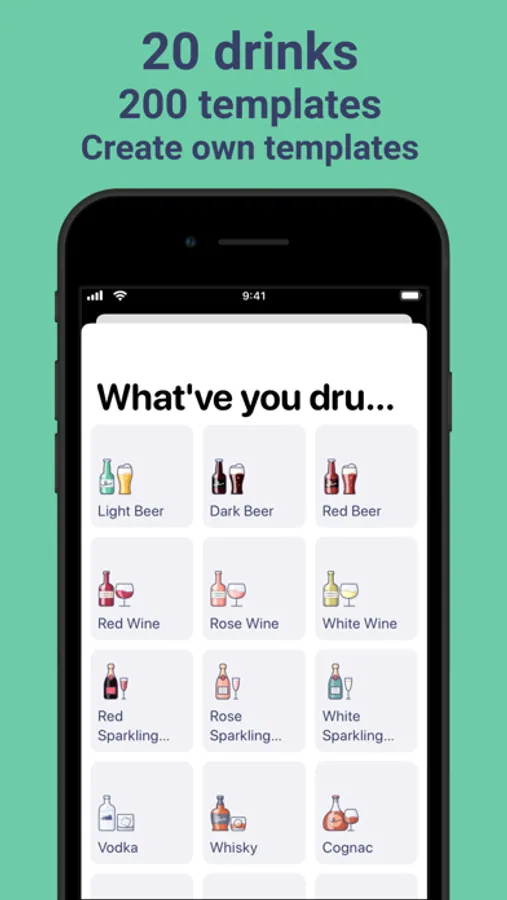 20 types of alcoholic drinks and 200 templates for quick entry.