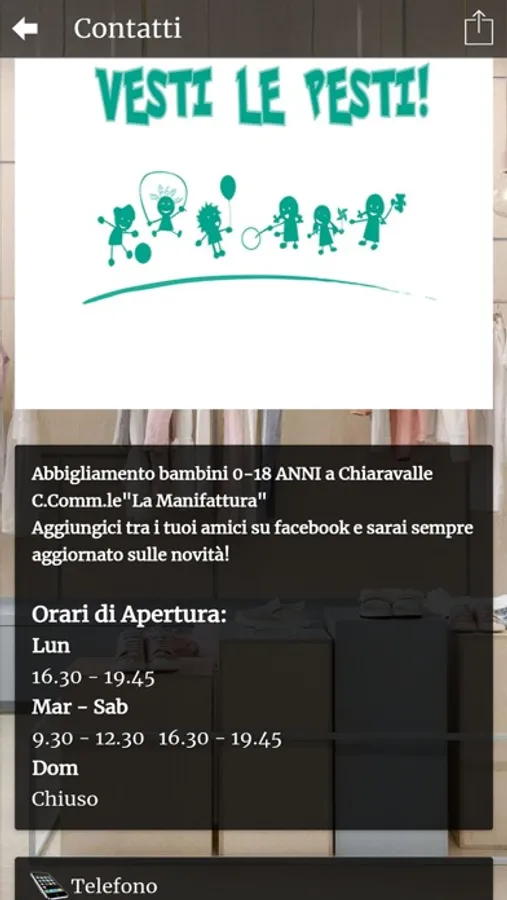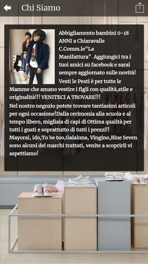 Nel nostro negozio potete trovare tantissimi articoli per ogni occasione! Dalla cerimonia alla scuola e al tempo libero, migliaia di capi di ottima qualità per tutti i gusti e soprattutto di tutti i prezzi!! Maiora, Ido, To be too, Gaialuna, Viaggino, Blue Seven sono alcuni dei marchi trattati, venite a scoprirli vi aspettiamo! Con la nostra nuova App potrete restare sempre aggiornati su tutte le nostre novità, eventi e promozioni. Potrete vedere il nostro shop online con le ultime novità.