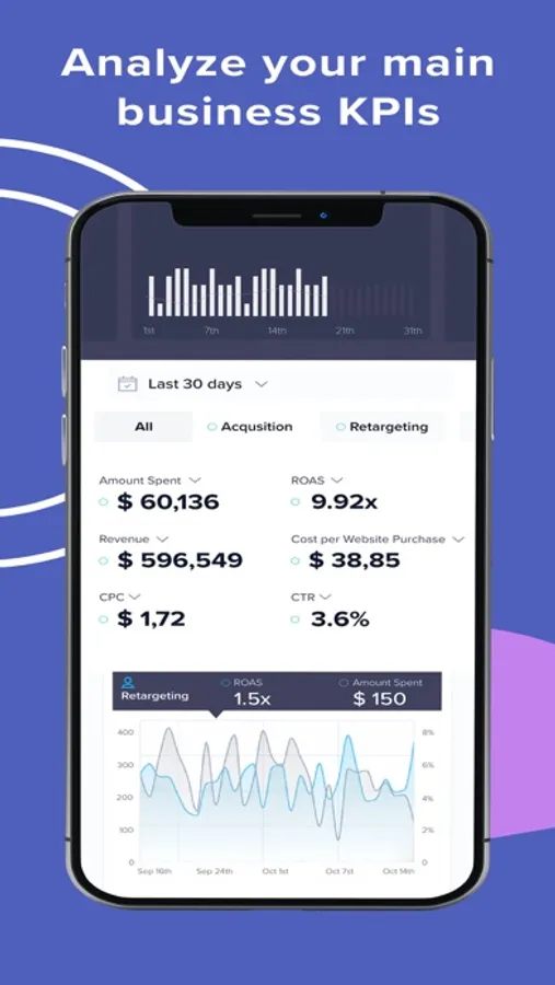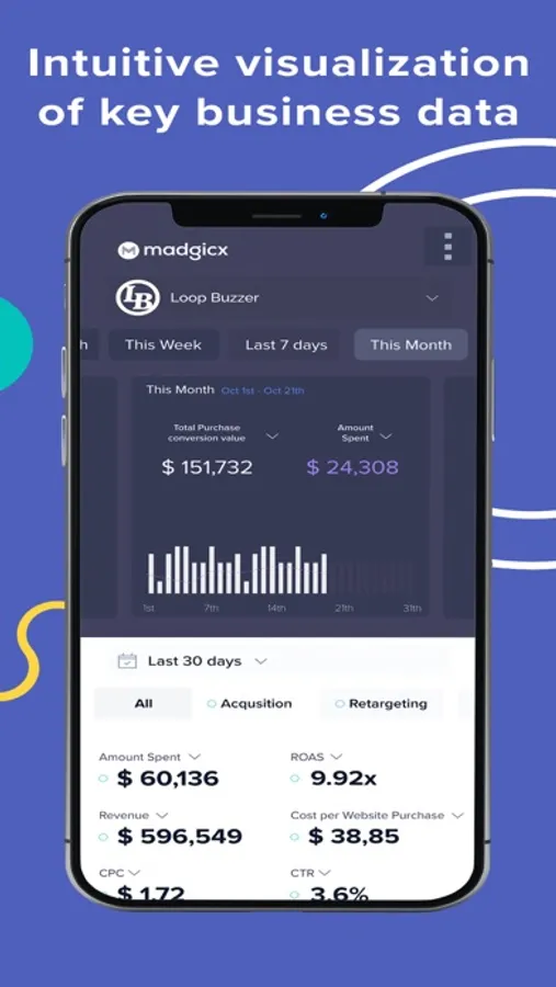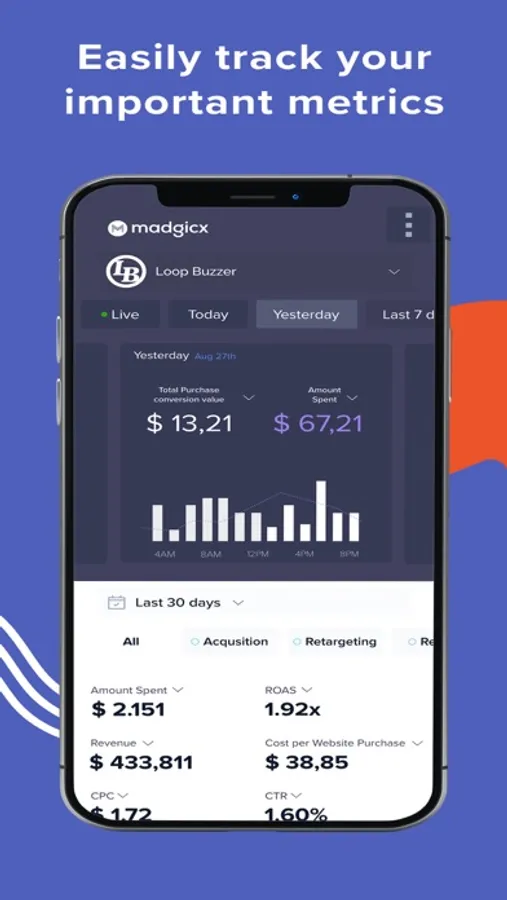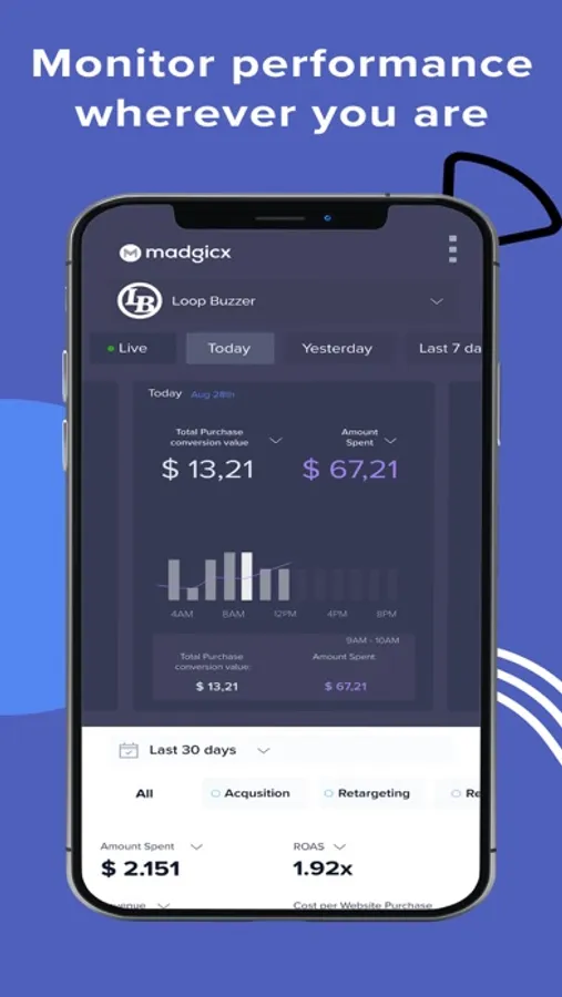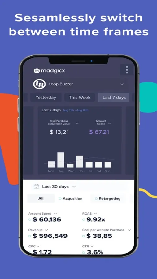 Sign up or log in to Madgicx Mobile and get immediate reporting. Seamlessly switch between different time frames by swiping right and left.
