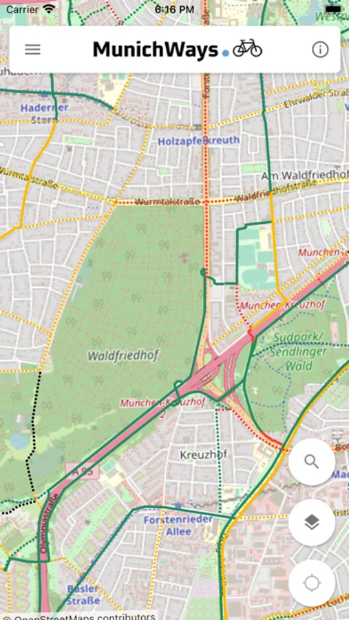 Die App zeigt Dir grüne Fahrrad Routen, die breit, sicher und eben sind. Und sie zeigt Dir rote und schwarze Radl-Strecken mit vielen Kreuzungen und fehlenden Radwegen in und um München.