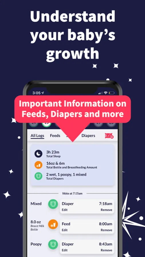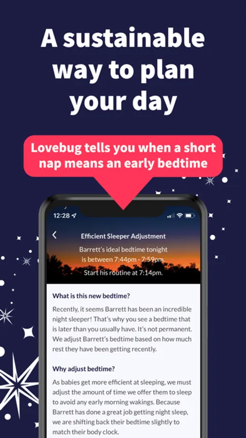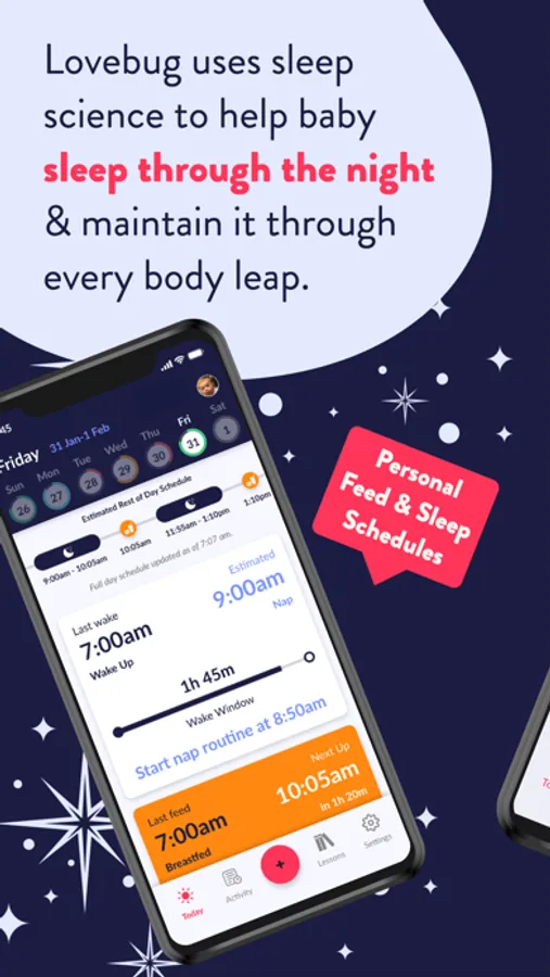 Lovebug presents you each morning with a fully personalized nap schedule based on your child's age and recent sleep patterns. Then, it updates throughout the day for missed naps, short naps, long naps, and really off days. You'll never have to question or struggle with when to offer the baby sleep.
