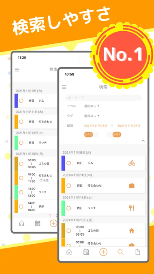 タイトル検索・期間検索・完了、未完了の切り替え・タスク・メモの切り替えで確認したいToDoを素早く表示することができます。
