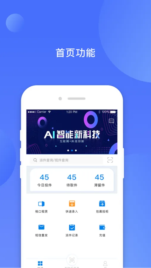 铁塔快递员App通过查快递、APP投件、格口租用等功能,可以更好的使用智能快递柜进行派件。操作的快递可以在数据中心进行统计查询,方便快捷。