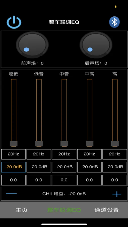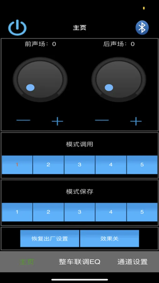 车载DSP控制,蓝牙连接,整车EQ调节,四门延时/音量/静音参数调整,场景模式一键调用,一键恢复出场设置
