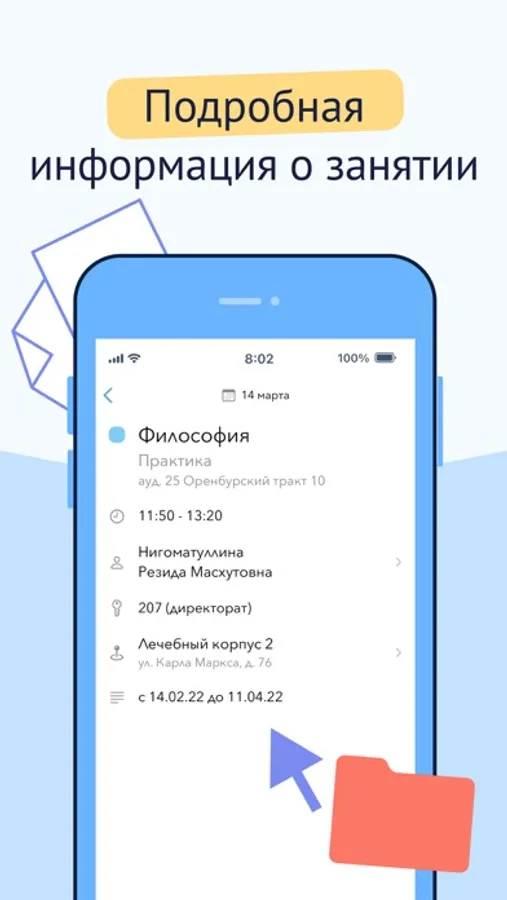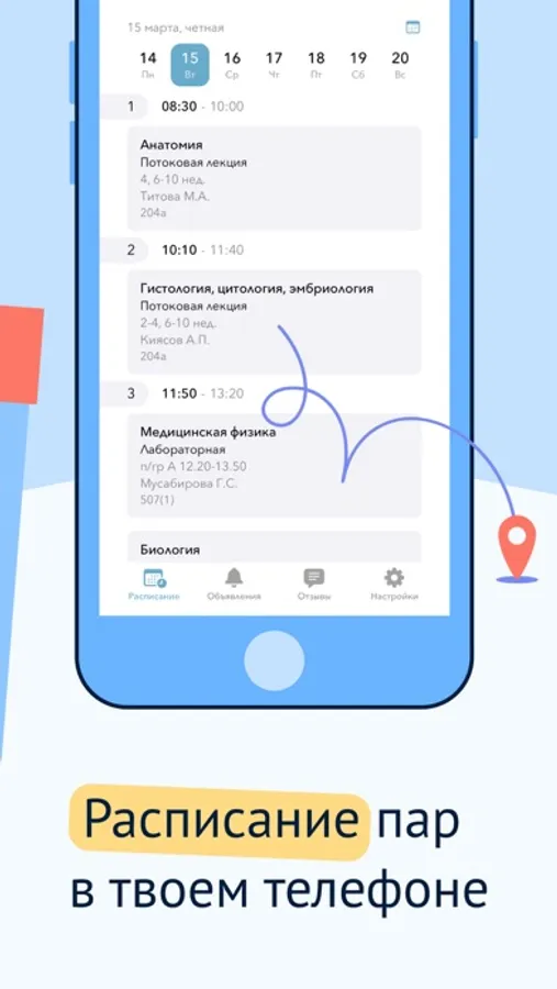 В карточке занятия вы найдете: название предмета, формат (лекция, практика, лабораторная и т. д.), время, ФИО преподавателя, № аудитории или место проведения занятия.