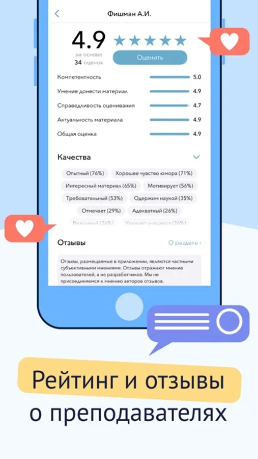 В разделе «Отзывы» можно найти преподавателя по поиску и посмотреть его оценки по критериям, основные качества и отзывы учащихся. Оценивайте любимых преподавателей своего вуза и оставляйте отзывы.