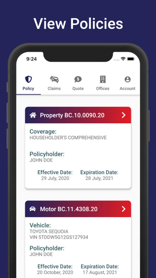 · view description of item(s) insured, effective and expiration date of coverage, and Certificate of Insurance.