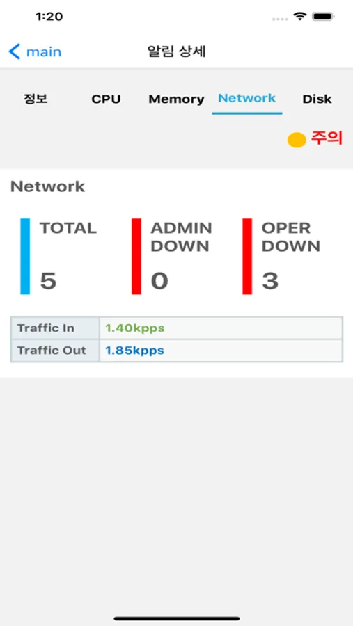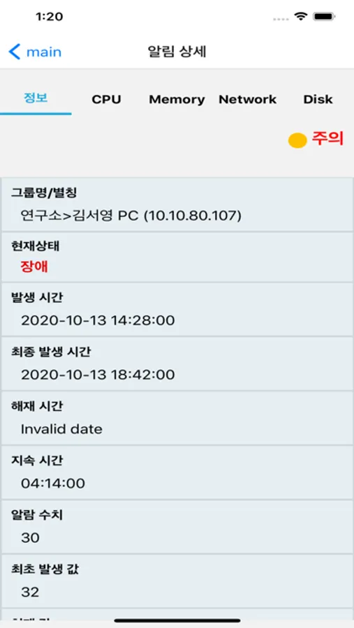 특정 장비에 대한 상세 모니터링 조회 화면으로 장비 Description, Availability, 서비스, Network Interface, CPU/MEM/Disk 추이, 프로세스 상세정보, 장애 이력관리 View 제공