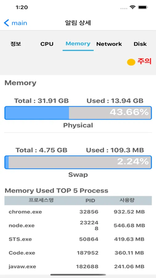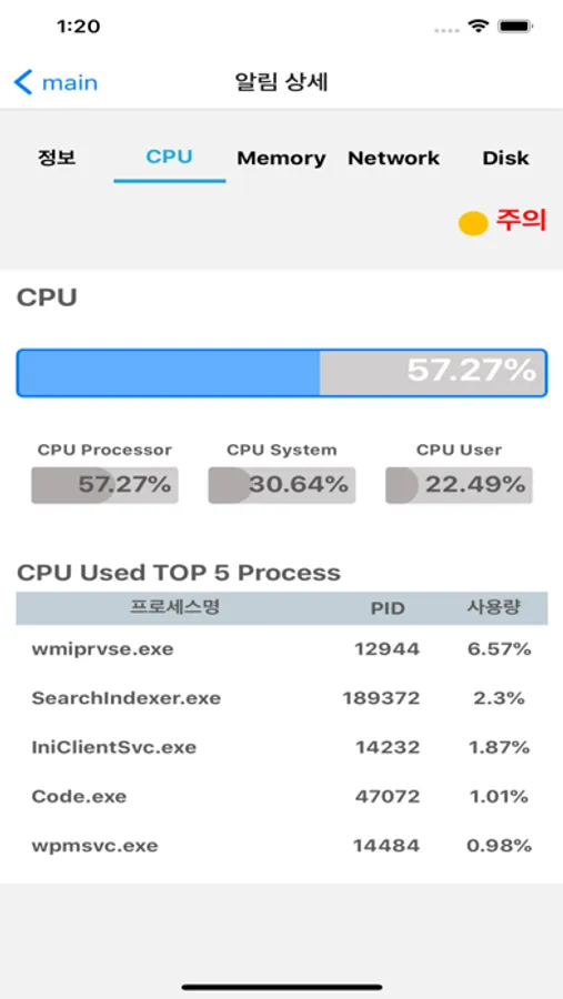 프로세스 상세 정보를 보고자 하는 대상 장비에 대한 전체 프로세스, CPU, Memory, I/O 모니터링이 가능하며 비교대상을 지정하여 프로세스 상세정보를 비교 가능함