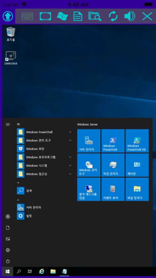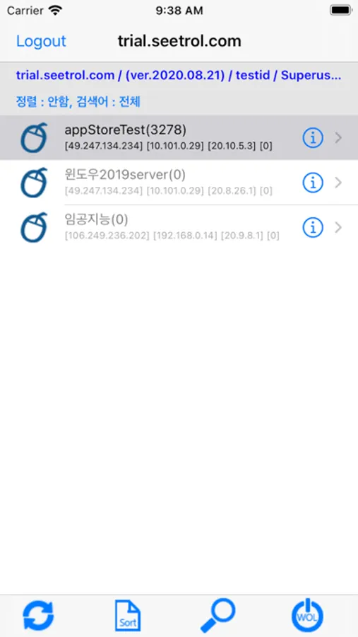 그리고 아이폰에서 SeetrolView App을 실행하고 해당 Seetrol소유형 서버를 등록합니다. 등록된 Seetrol소유형 서버에 로그인하면 로그인된 SeetrolAsk 즉, 원격지 PC 리스트를 볼 수 있습니다. 목록 중 원격제어하고자 하는 클라이언트 PC를 선택하면 원격제어가 시작됩니다.