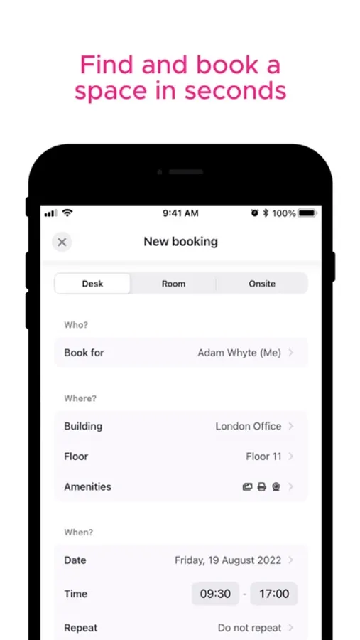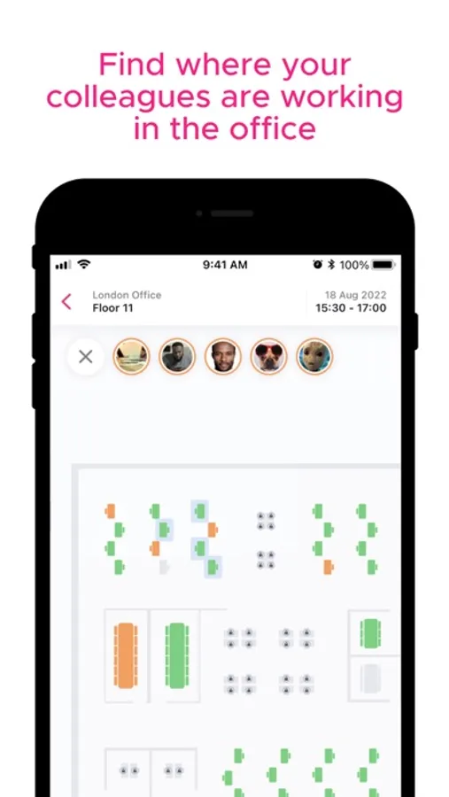 • Desk booking - Find and locate team members on the interactive office floor map and book a space nearby
