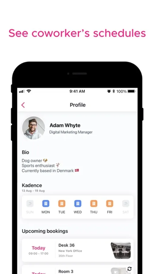 • Personal profiles - Plot your weekly Kadence, set workplace preferences, and tell your colleagues a bit about yourself