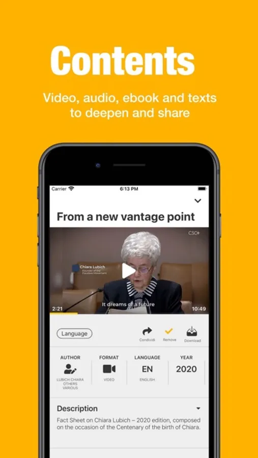 There are also social share buttons available for each content: video, audio, text (PDF), ebook, organized and searchable by the user through various modes. There are thematic playlists (lists of mixed types of content presented in a pre-established order), and you can also search by tag, date, author, multilingual ….; there is a possibility of editorial management of the homepage (e.g. contents to be shown/playlists on current events/freely editable banners).
