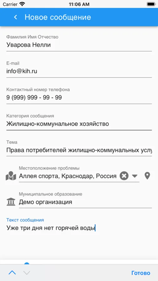 Для отправки обращения необходимо заполнить поля регистрационной формы и нажать кнопку «Отправить».