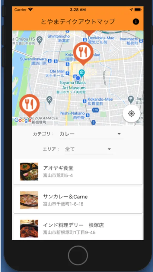 富山県のテイクアウト可能店舗をマップとリストで表示するアプリケーションです。株式会社チューリップテレビのWebサイト「とやまテイクアウトマップ」とデータを連動しています。