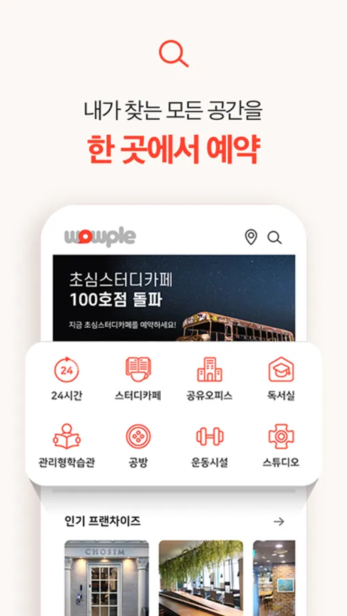 스터디카페/독서실/공유오피스 등 다양한 공간을 실시간 예약할 수 있습니다.
