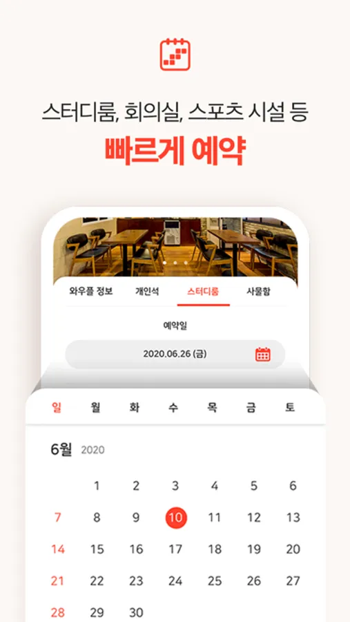 스터디룸, 회의실, 화상면접실 등 원하는 일정에 맞춰 앱 예약해요.