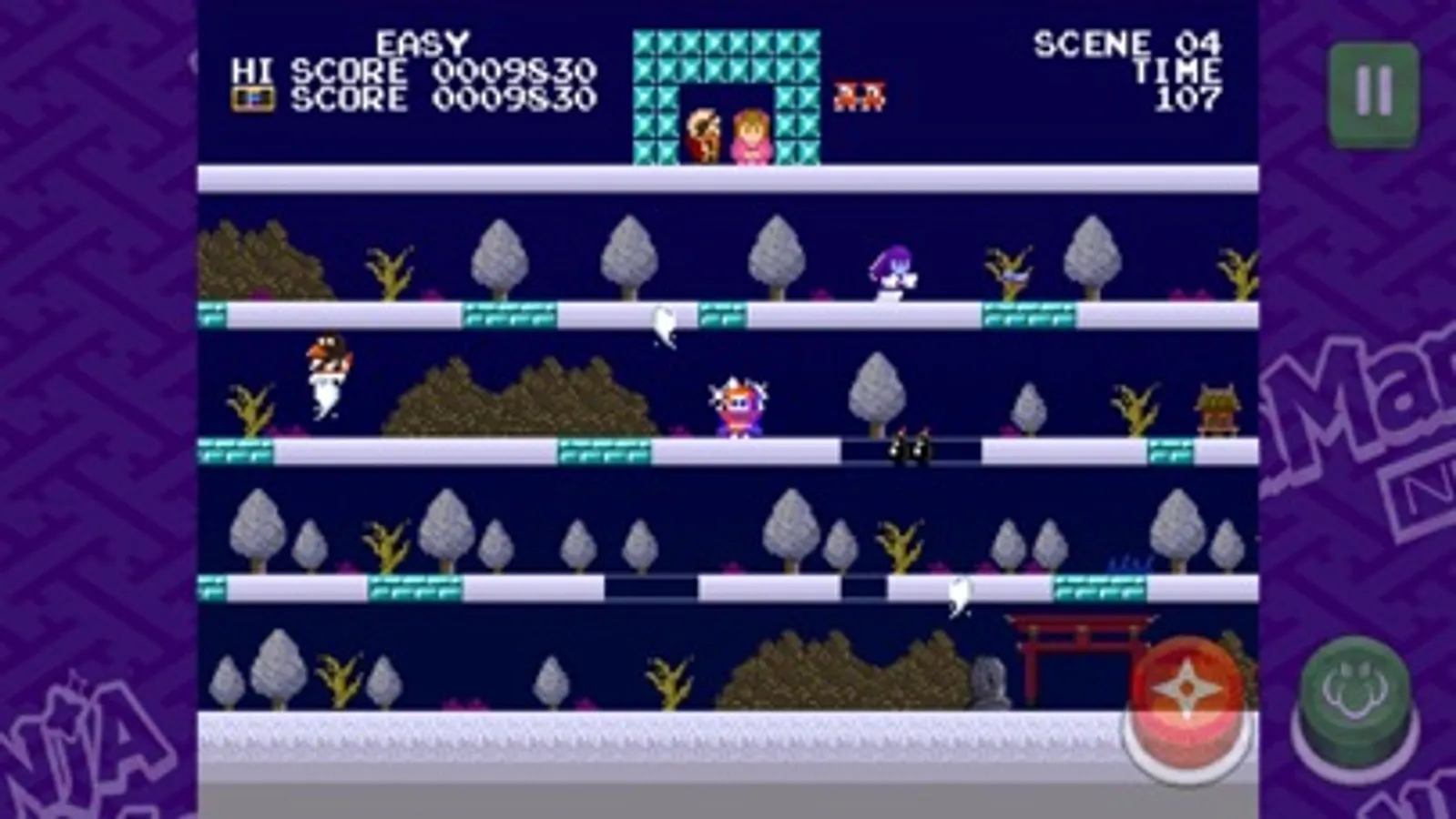 Able to move the Jajamaru by dragging left and right,jump by touching jump button,and shoot Ninja stars by touching Ninja star button. The Ninja star button becomes a downward move button when a toad appears. Ceiling blocks can be destroyed by jumping. Items may appear randomly.