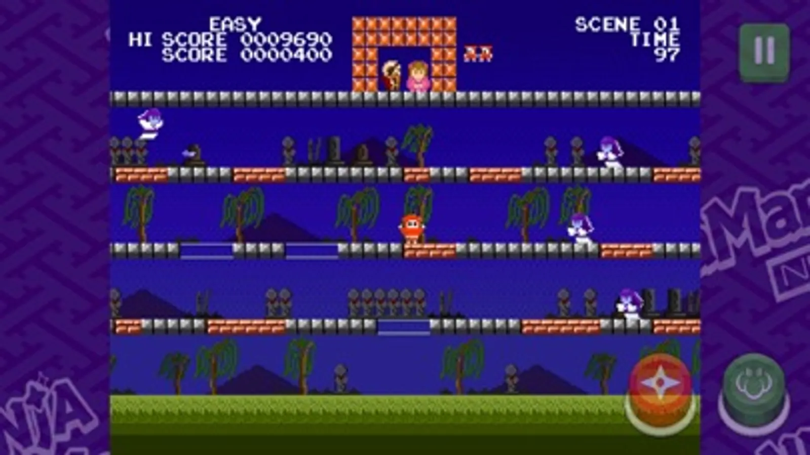 Clear the stage 1 by defeating all 8 enemies. Use ninja star, jump, and powerful items to break through 50 stages.