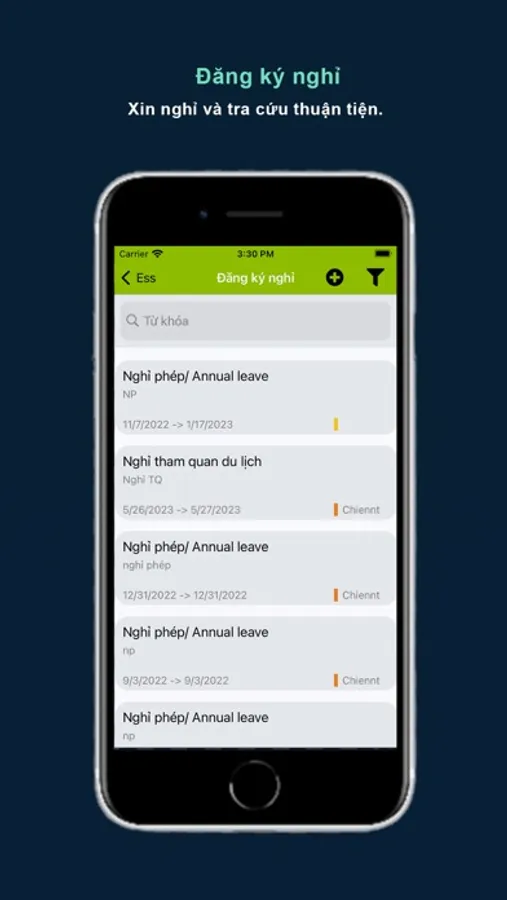 - TEAM: Duyệt đăng ký nghỉ, duyệt đăng ký làm thêm, duyệt đăng ký chuyển ca, duyệt vào-check in/ra-check out