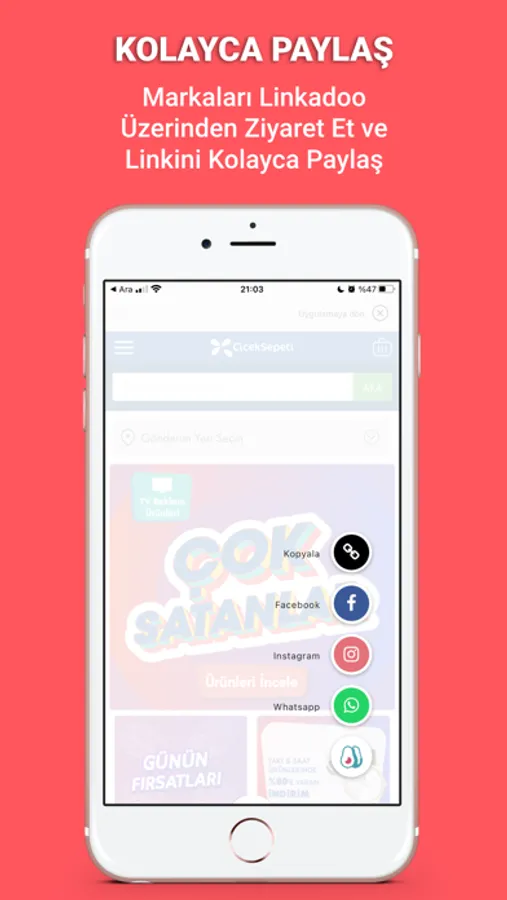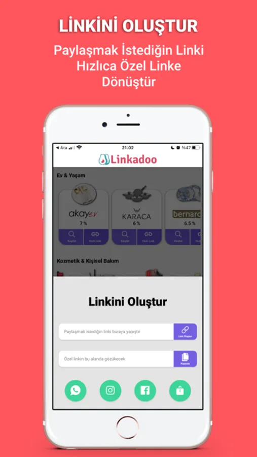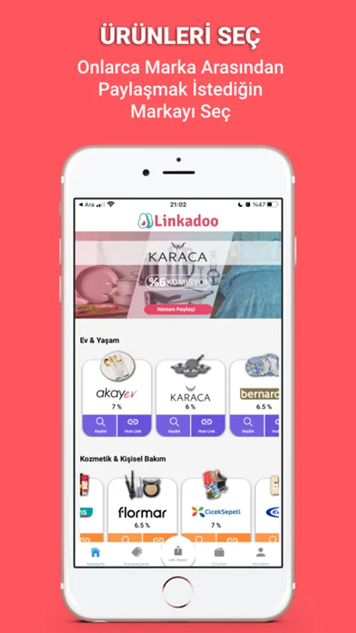 Linkadoo mobil uygulamasını indir, Karaca, Watsons, Çiçek Sepeti, Teknosa, English Home, Emsan, Jumbo, Bernardo, Chakra, Bella Maison, The Body Shop, Vivense ve Flormar ve birçok farklı sevilen markadan istediğin ürün ve kampanyayı seç.