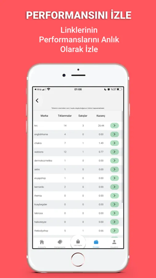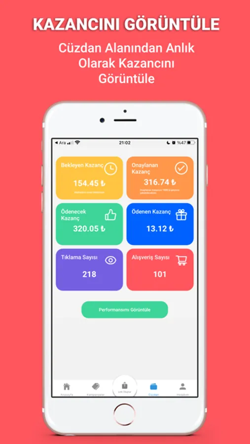 Cüzdan ve Performans Bilgilerim alanlarından linklerinden gelen tıklama, alışveriş sayısı ve kazançlarını anlık olarak takip edebilirsin.