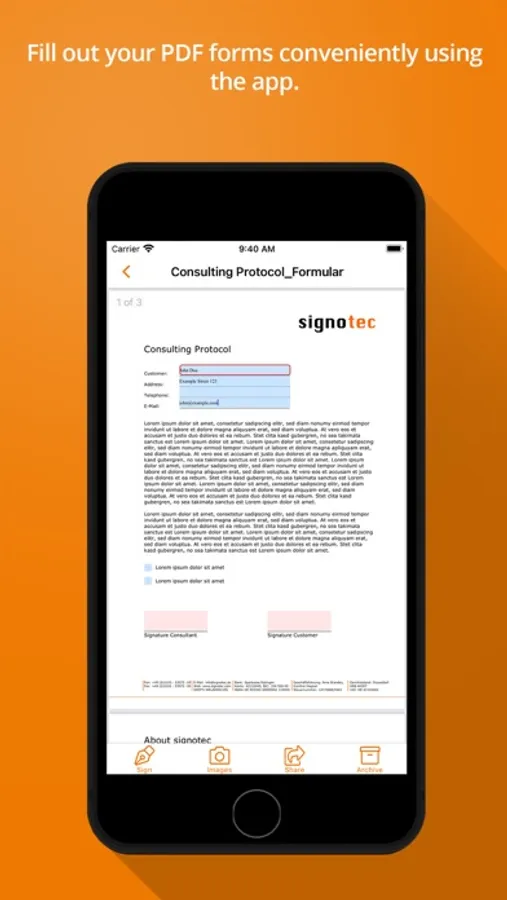 With the signoSign App for Apple iOS you can fill out and edit PDF forms and sign them electronically on your iPhone or iPad. The iOS-typical file management view makes it easy for you to manage your documents in individual folders or by accessing your iCloud or other cloud services - so you always have all your PDF files at hand for editing. The app also allows you to store templates that you can reuse as blank forms.
